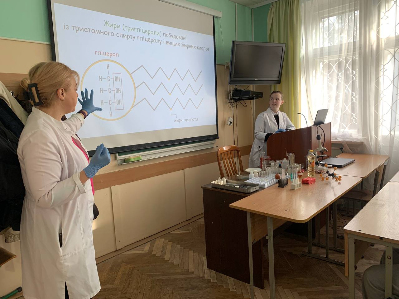 Найцікавішою стала практична частина заняття, під час якої студенти виконували досліди з визначення наявності жирів і білків у різних харчових продуктах. Зокрема, вони спостерігали характерні ознаки жирів (жирні плями, утворені від добутих жирів з насіння природних культур, розчинність твердих і рідких жирів у різних рідинах та за різних умов, реакції з барвниками) та проводили біуретову та ксантопротеїнову реакції для виявлення білкових молекул, а також їх денатурацію при дії різних чинників. У ході експериментів студенти переконалися, що навіть традиційні продукти харчування можуть слугувати об’єктом наукового дослідження, а знання з біології та хімії мають важливий практичний застосунок.